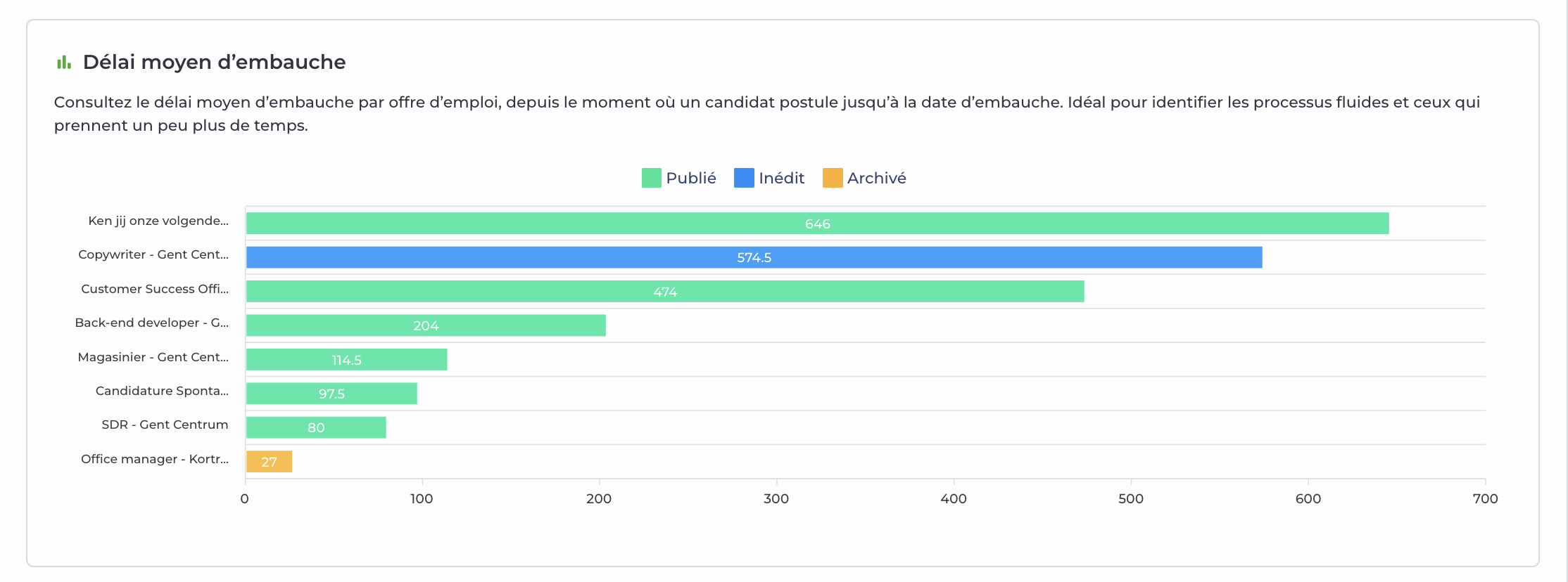 Dans le module Statistiques, sous l’onglet Aperçus des offres d’emploi, vous trouverez le graphique intitulé Délai moyen d’embauche.