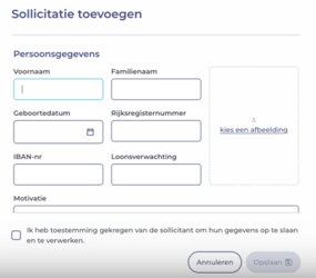 Onderaan het scherm vind je de bevestiging dat je toestemming hebt gekregen om de gegevens van de kandidaat te verwerken en op te slaan.