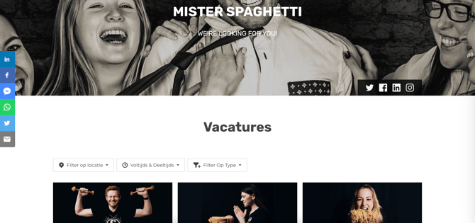 Een goed voorbeeld hiervan is Mister Spaghetti. Na het klikken op ‘Jobs’ op hun site verschijnt een knop waarmee je alle vacatures kunt bekijken. Deze leidt naar de Jobtoolz-site met het vacatureoverzicht.