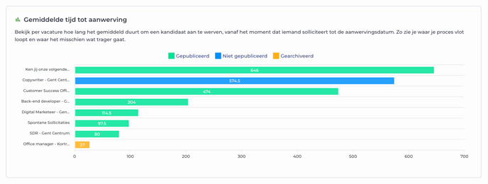 In de module "statistieken" vind je onder de tab "Inzichten Vacatures" de grafiek "Gemiddelde tijd tot aanwerving" terug.